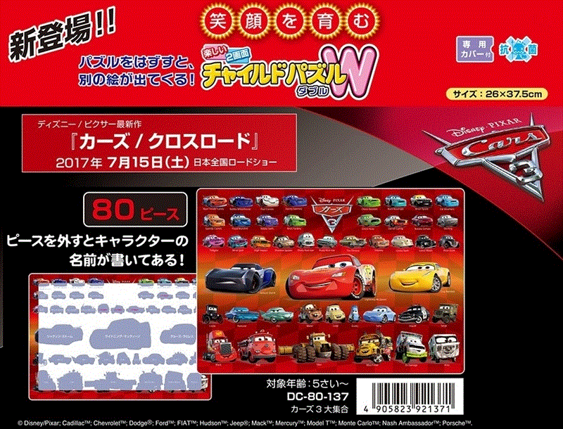 ピース数 板パズル80ピース サイズ 26cm×37.5cm(台紙のサイズ) 作家名・作品名・商品シリーズ名 ディズニー/ピクサー/カーズ3/カーズ クロスロード 特徴 【チャイルドパズル/ダブルシリーズ】幼児向け板パズル(ボードパズル)です。