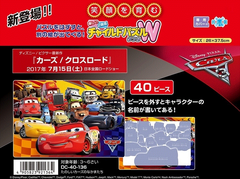 ピース数 板パズル40ピース サイズ 26cm×37.5cm(台紙のサイズ) 作家名・作品名・商品シリーズ名 ディズニー/ピクサー/カーズ3/カーズ クロスロード 特徴 【チャイルドパズル/ダブルシリーズ】幼児向け板パズル(ボードパズル)です。
